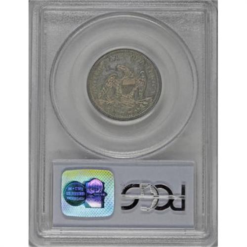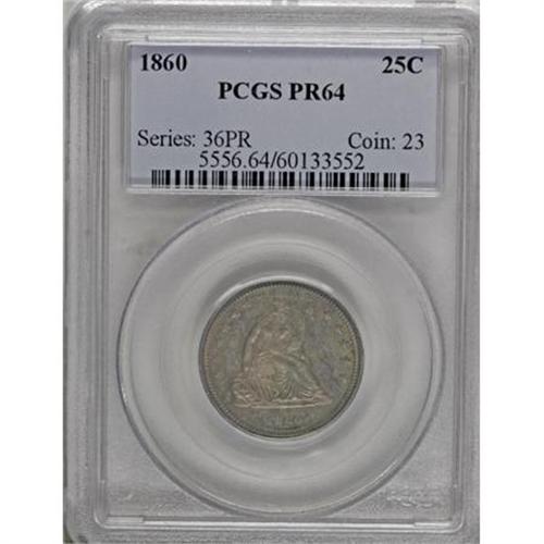 <B>1860 25C PR64 PCGS.</B></I> Type Two Obverse, Type One Reverse. Variegated tan and steel-blue toning adorns this moderately mirrored specimen. Precisely struck aside from the star centers, and the fields are only faintly hairlined. Much scarcer than the mintage of 1,000 pieces suggests, since unsold examples were melted by the Mint. Population: 43 in 64, 22 finer (8/07).<BR><BR><B>Coin Engraver:</B> Christian Gobrecht<BR><BR><b>Shipping:</b> Coins & Currency (<a target="_blank" href="http://www.heritageauctions.com/common/shipping.php">view shipping information</a>)