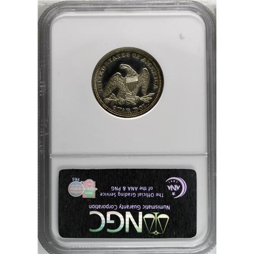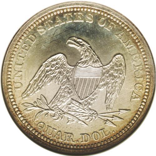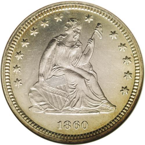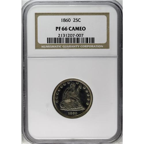 <B>1860<25C> PR66 Cameo NGC.</B></I> Type Two Obverse. Light orange toning endows this unmarked Premium Gem. The major devices are intricately struck, although a few left side stars are soft. Moderate frost distinguishes the devices from the seamless mirrored fields. Much scarcer than indicated by the mintage of 1,000 pieces. Census: 2 in 66 Cameo, 2 finer (6/06).<BR><I>From The Mulholland Collection.</B></I>