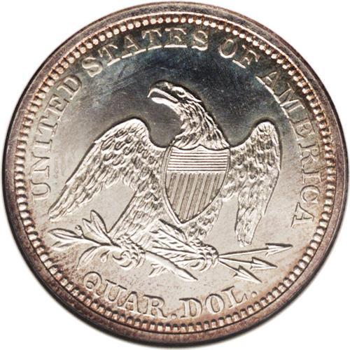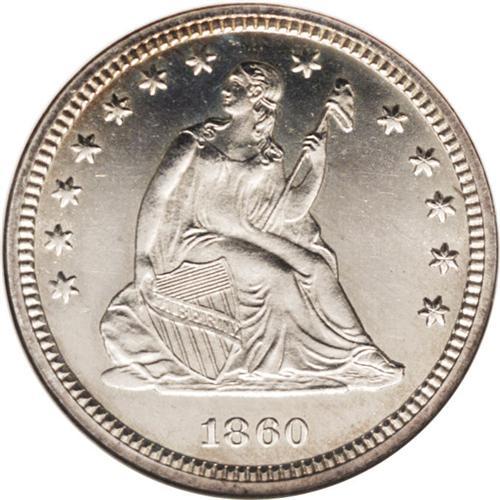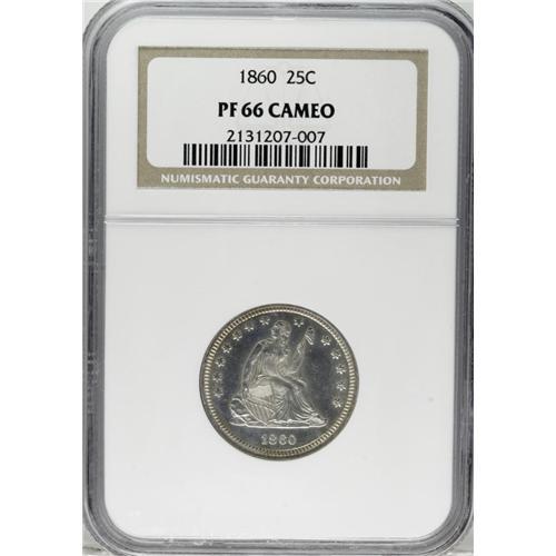 <B>1860 25C PR66 Cameo NGC.</B></I> Type Two Obverse. Light orange toning endows this unmarked Premium Gem. The major devices are intricately struck, although a few left side stars are soft. Moderate frost distinguishes the devices from the seamless mirrored fields. Much scarcer than indicated by the mintage of 1,000 pieces. Census: 2 in 66, 2 finer (12/06).<BR><BR><b>Shipping:</b> Coin/Currency (<a target="_blank" href="http://www.heritageauctions.com/common/shipping.php">view shipping information</a>)