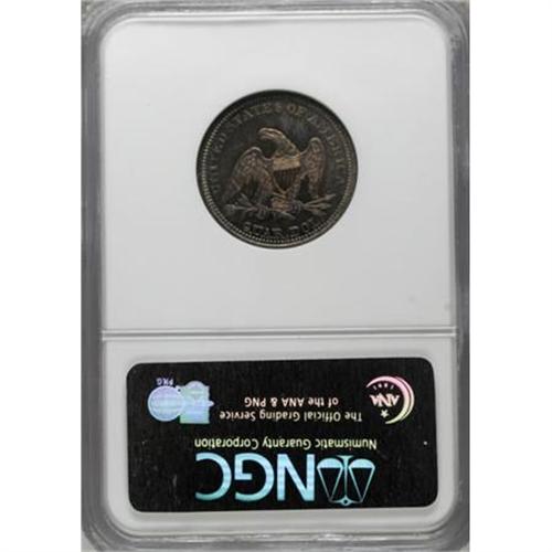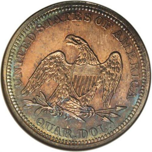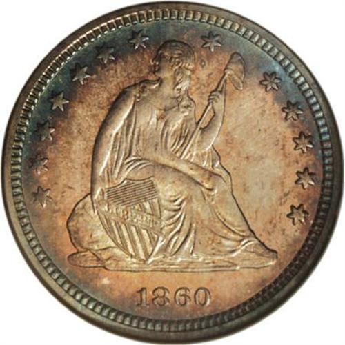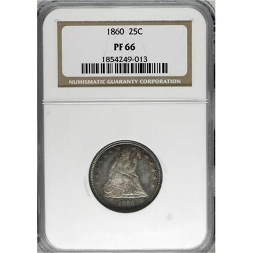 <B>1860 25C PR66 NGC.</B></I> The main Mint in Philadelphia coined a round 1,000 proofs for this year, though numismatists speculate that not all were sold. Both sides of this Premium Gem offer exquisitely detailed central devices and beautiful color. Delicate rose and champagne toning with a crescent of blue graces the obverse, while the reverse exhibits similar, slightly deeper patina.<BR><BR><B>Coin Engraver:</B> Christian Gobrecht<BR><BR><b>Shipping:</b> Coins & Currency (<a target="_blank" href="http://www.heritageauctions.com/common/shipping.php">view shipping information</a>\)