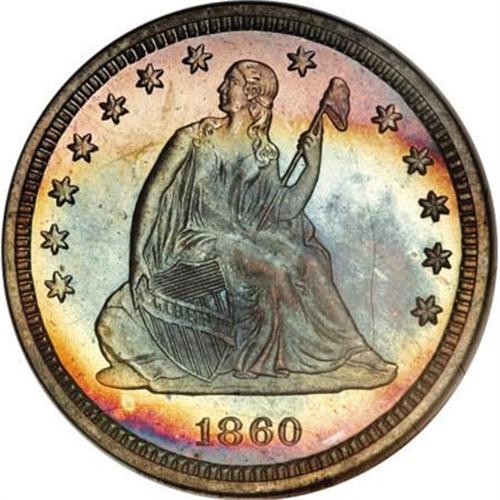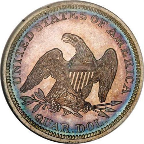 <B>1860 25C PR67 <img src="/images/star.gif" width="10" height="10" alt="" border="0"> NGC.</B></I> In 1860, the Mint struck a round 1,000 proofs for the quarter issue, a figure that would remain tied for the highest such mintage for the denomination until 1876. Yet examples remain elusive in the numismatic marketplace today, particularly with strong eye appeal. Likely, a number of them went unsold and were melted.<BR> The magnificent specimen offered here has not merely survived for over a century. Its magnificent preservation bespeaks careful custodianship, and the coin's bold definition and vibrant patina combine for amazing eye appeal. Bands of rose, green-gold, aqua, violet, mustard-gold, magenta, and sky-blue grace the obverse, while the reverse has an outer band of sapphire that surrounds a rose-violet center. A small depression to the left of Liberty's shield arm may assist with future identification. Among pieces without the Cameo designation, this is the single finest certified by NGC (12/07).<BR><BR><B>Coin Engraver:</B> Christian Gobrecht<BR><BR><b>Shipping:</b> Coins & Currency (<a target="_blank" href="http://www.heritageauctions.com/common/shipping.php">view shipping information</a>)