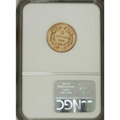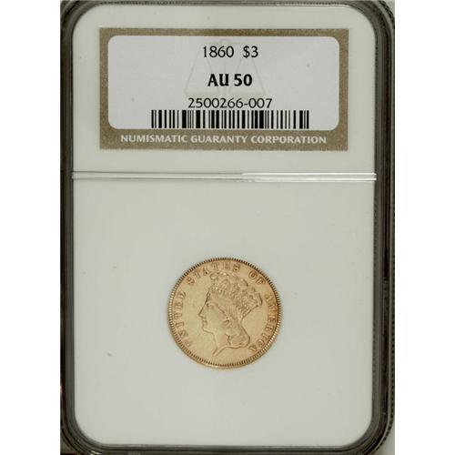 1860 $3 AU50 NGC. A scant 7,036 pieces were struck for