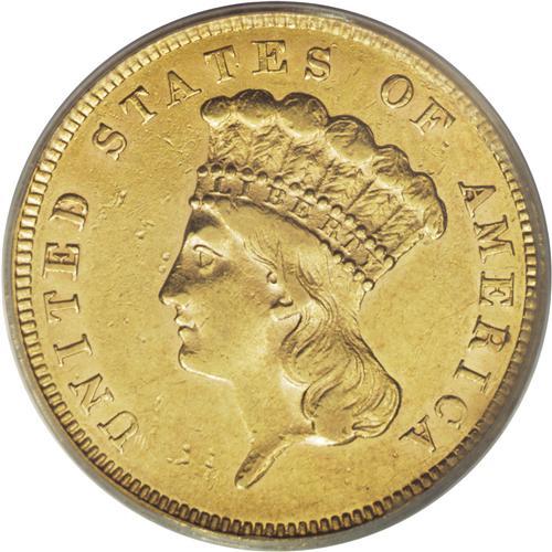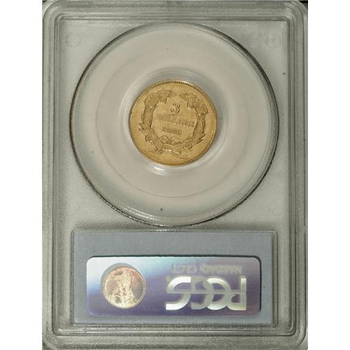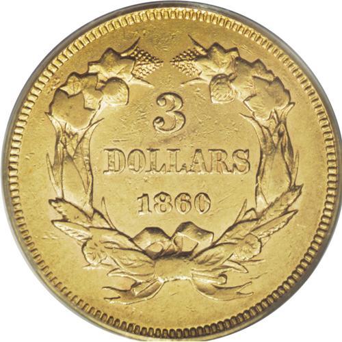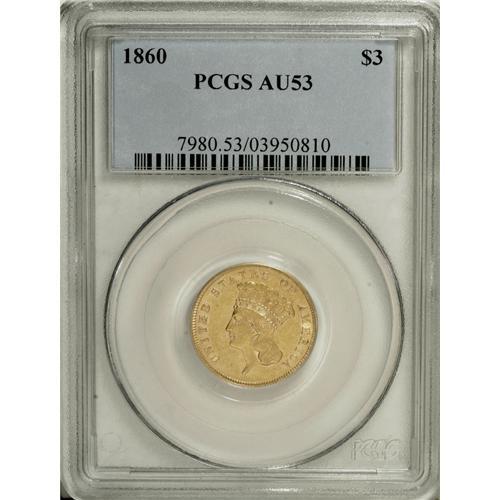 1860 $3 AU53 PCGS. The 1860 has a low production of 7,