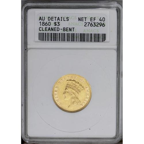 <B>1860<$3>--Cleaned, Bent--ANACS. AU Details, Net XF40.</B></I> A hairlined but splendidly detailed better date three dollar gold piece with only slight highpoint wear on the forehead and curl over the ear. Just 7,036 pieces were struck. <BR><BR><B>Important notice:</B> Heritage usually auctions material at the rate of 200-250 lots per hour. On some occasions eBay Live bid software or the Internet may not be able to keep up with the pace of the auction. We recommend placing a realistic absentee bid now as insurance to avoid disappointment. Occasionally the auctioneer may eliminate or reject an eBay Live bid, and the auctioneer may also reopen a lot after the close of the eBay live bidding (usually because we missed an audience bid), and may reject your bid even if it shows you as the winning bidder. By bidding via eBay Live, you agree that Heritage may award the lot to another bidder at its sole discretion under the circumstances described above or any other reasonable circumstances. Since eBay bids are not shown to us until we open the lot on the floor, we treat those bids just like floor bids. In most cases the floor responds before the eBay bid is presented to us, due to Internet lag time, so for consistency we have made it a policy that floor bids are always considered first over tie eBay live bids. Also please note that all Heritage lots purchased through eBay Live carry a 20% Buyer's Premium. Please make sure you read the Terms and Conditions before you bid. This lot is being auctioned in conjunction with a live floor auction by Heritage Galleries & Auctioneers. All final auction and invoice information will be supplied by Heritage Galleries & Auctioneers, and all other information should be considered preliminary. Lot:2577 <BR><BR><B>Winning Notification and Billing:</B> After the FINAL session in this auction is complete, Heritage will send e-mail and snail mail invoices. This process normally takes several days. All final auction and invoice information will be supplied by Heritage Galleries & Auctioneers, and all other information should be considered preliminary. <BR><BR>This auction will be conducted on a live auction floor and over the Internet through eBay Live. If you choose to place an absentee bid, please take a moment to <font color='#0000ff'><u><a href='http://pages.ebay.com/liveauctions/help/before/laabsentee.html'>learn how eBay Live absentee bidding works</a></u></font><font color='#000000'>