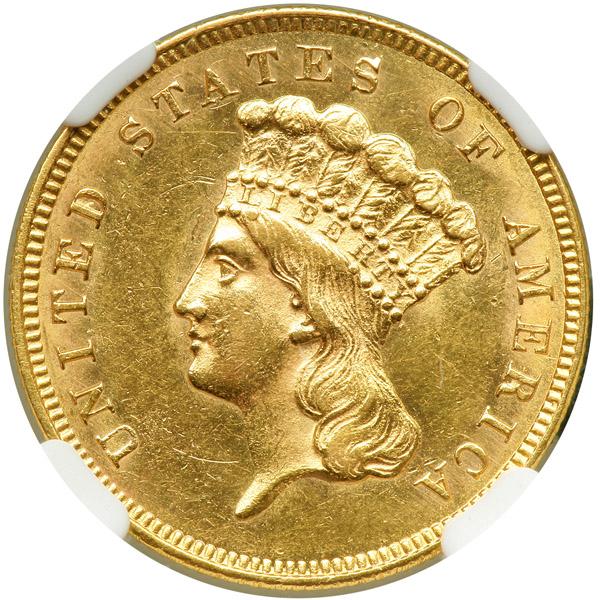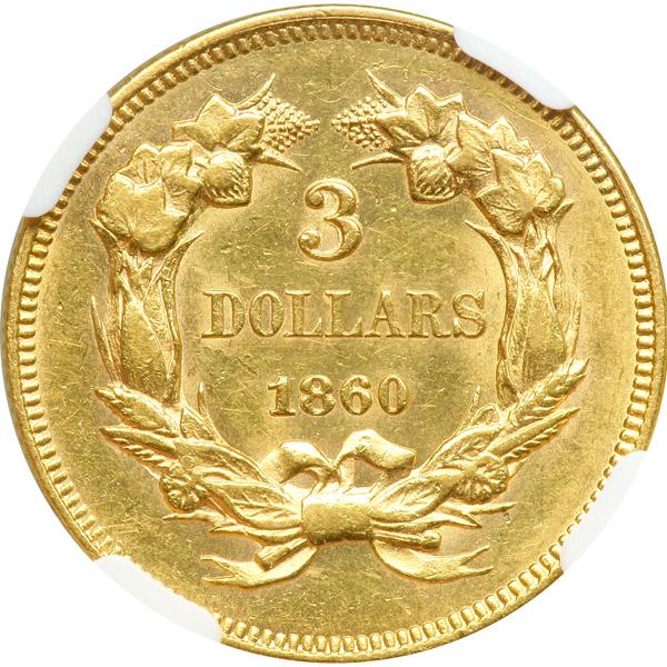 1860. NGC graded MS-61. Well struck and lustrous, untoned. This well struck $3 should find a ready buyer and an apprecciative home in a collectors set of rare-date gold. Only 7,036 struck. Pop 30; 44 finer (PCGS # 7980) .