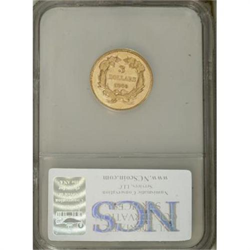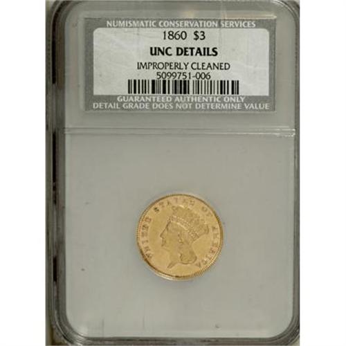 <B>1860 $3 --Improperly Cleaned--NCS. Unc. Details.</B></I> The fields are hairlined, but this boldly struck representative exhibits bright luster throughout the legends and design crevices. Only 7,036 business strikes were coined.<BR><BR><B>Coin Engraver:</B> James B. Longacre<BR><BR><b>Shipping:</b> Coins & Currency (<a target="_blank" href="http://www.heritageauctions.com/common/shipping.php">view shipping information</a>)