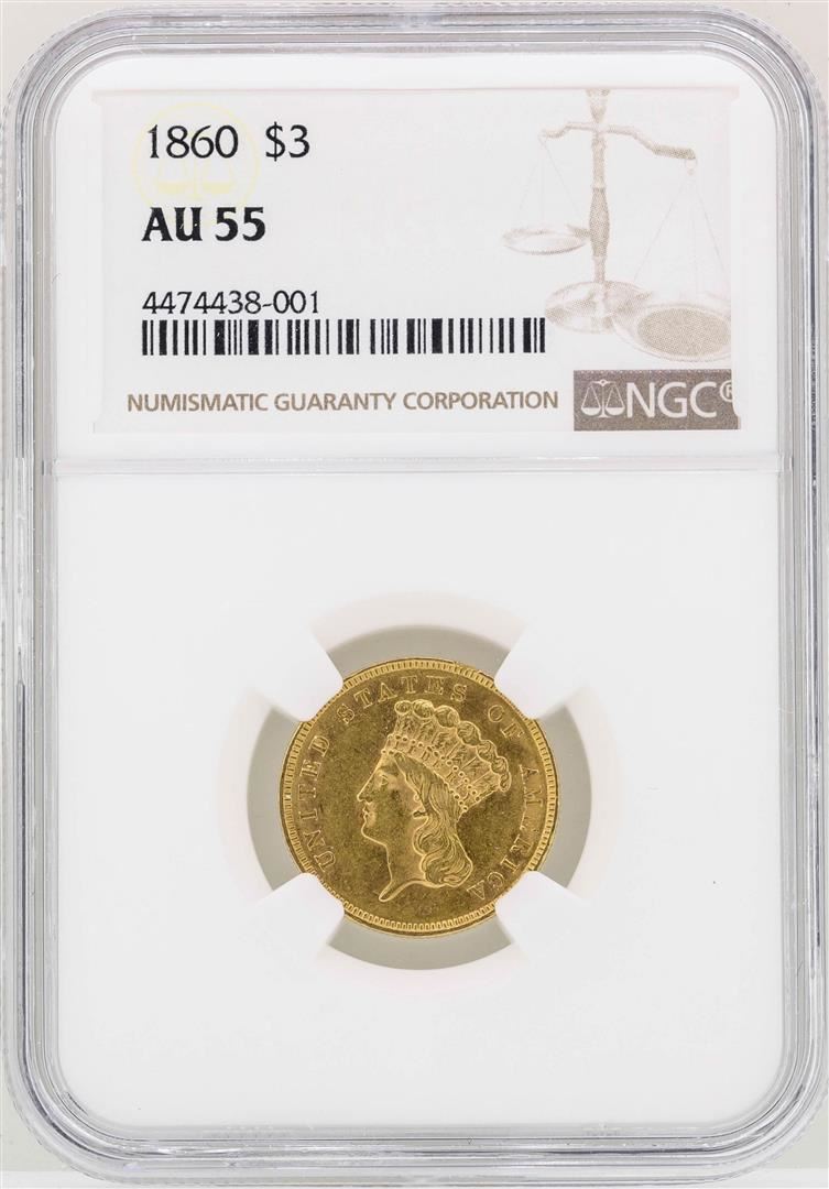 One 1860 $3 Indian Princess Head Gold Coin NGC AU55. NGC Certified.