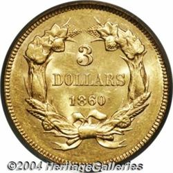 <table><tr><td><table><tr><td>1860 $3 MS62 NGC. A moderately scarce issue overall from a mintage of only 7,036 business strikes. Perhaps less than one percent of that figure survives in Mint State. The example offered here display bright cartwheel effect on the obverse and more of a satiny sheen on the reverse. Only the highpoints of the wreath show appreciable softness. Population: 17 in 62, 21 finer (3/04). <BR><BR><B>Important notice:</B> Heritage usually auctions material at the rate of 200-250 lots per hour. On some occasions eBay Live bid software or the Internet may not be able to keep up with the pace of the auction. We recommend placing a realistic absentee bid now as insurance to avoid disappointment. Occasionally the auctioneer may eliminate or reject an eBay Live bid, and the auctioneer may also reopen a lot after the close of the eBay live bidding (usually because we missed an audience bid), and may reject your bid even if it shows you as the winning bidder. By bidding via eBay Live, you agree that Heritage may award the lot to another bidder at its sole discretion under the circumstances described above or any other reasonable circumstances. Since eBay bids are not shown to us until we open the lot on the floor, we treat those bids just like floor bids. In most cases the floor responds before the eBay bid is presented to us, due to Internet lag time, so for consistency we have made it a policy that floor bids are always considered first over tie eBay live bids. Also please note that all Heritage lots purchased through eBay Live carry a 20% Buyer's Premium. Please make sure you read the Terms and Conditions before you bid. <BR><BR><B>IMPORTANT ANNOUNCEMENT ABOUT RESERVES:</B> Heritage now divulges all reserves on its web site 7 days before every auction. If you want to know whether the reserve on this lot has been met, and if not, what the reserve amount is, please visit this lot page on the HeritageCoin.com web site, or email: bid@HeritageGalleries.com </span></font></td></tr></table></td></tr></table>