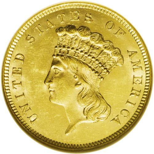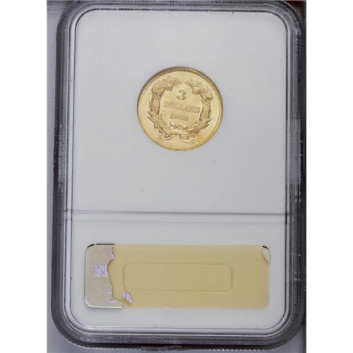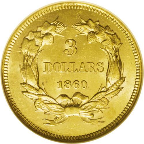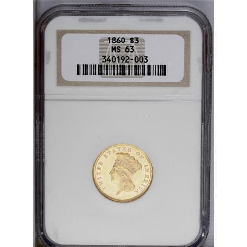 <B>1860<$3> MS63 NGC.</B></I> A lovely example that benefits from unbroken cartwheel sheen and an exemplary strike. Except for a small area of faint, brief, thin marks to the left of the date, the surfaces are refreshingly smooth. The eye appeal is impressive for the MS63 grade. In 1860, double eagles were the favored gold denomination of the Philadelphia Mint. The 1860 three dollar piece has a low mintage of 7,036 pieces, but because of formidable type demand for three dollar gold, better dates such as the 1860 trade for little premium. Given that the 1878 is perhaps fifty times more available at the MS63 level, the 1860 certainly provides superior value. Certified in a prior generation holder. Census: 10 in 63, 6 finer (7/06).<BR><I>From The Derrick Snider Collection.</B></I>