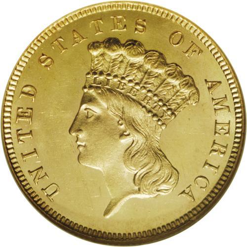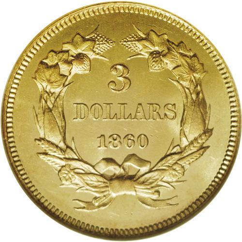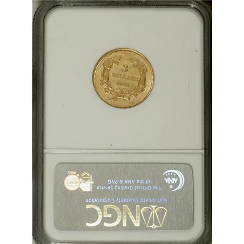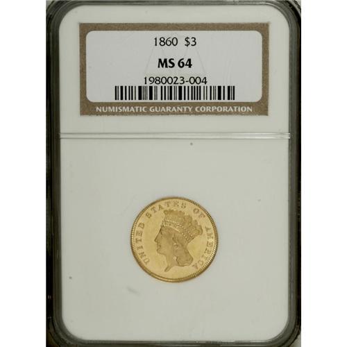<B>1860 $3 MS64 NGC.</B></I> A sharply struck and Choice Mint State example with satiny yellow surfaces and full mint brilliance. This is a scarce date from a mintage of just 7,036 coins. Perhaps just a few hundred of those pieces still exist, with the total population easily below 1,000 coins, and few of them are in Mint State grades. Dave Bowers estimates the total population of Mint State coins at 45 to 60 pieces in all grades. Choice Mint State pieces such as this coin are highly elusive, and finer Gem specimens are extremely rare. Census: 5 in 64, 2 finer (2/07).<BR><BR><b>Shipping:</b> Coins & Currency (<a target="_blank" href="http://www.heritageauctions.com/common/shipping.php">view shipping information</a>)