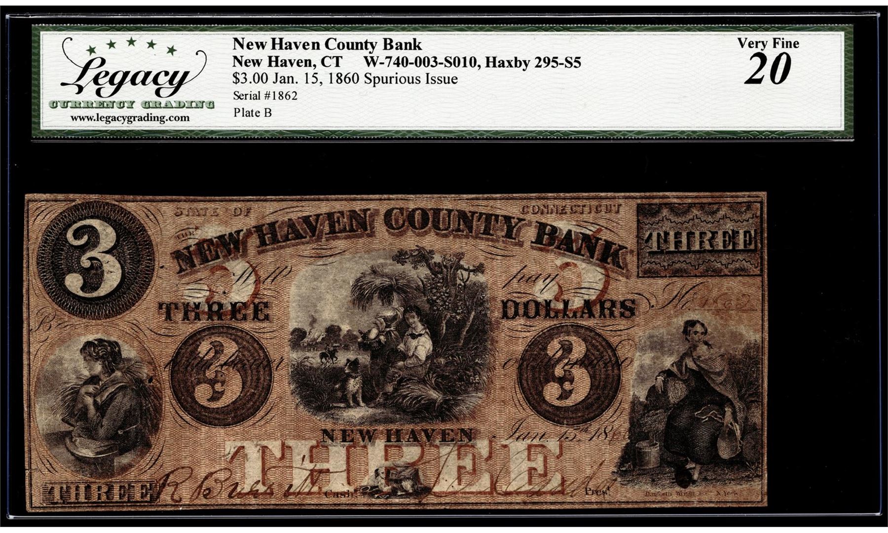 1860 $3 New Haven County Bank Connecticut Obsolete Note Legacy Very Fine 20