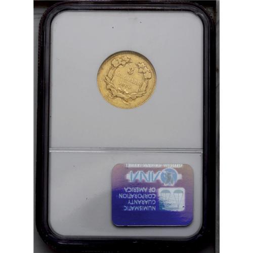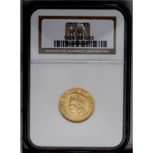 <B>1860<$3> XF40 NGC.</B></I> Evenly worn with reduced luster and green-gold color supplemented by coppery-red accents on the peripheral devices. Hairlines and surface blemishes are minimal. Only 7,036 business strikes were produced.<BR><I>From The Steve Glenn Collection.</B></I> <BR><BR><B>Important notice:</B> Heritage usually auctions material at the rate of 200-250 lots per hour. On some occasions eBay Live bid software or the Internet may not be able to keep up with the pace of the auction. We recommend placing a realistic absentee bid now as insurance to avoid disappointment. Occasionally the auctioneer may eliminate or reject an eBay Live bid, and the auctioneer may also reopen a lot after the close of the eBay live bidding (usually because we missed an audience bid), and may reject your bid even if it shows you as the winning bidder. By bidding via eBay Live, you agree that Heritage may award the lot to another bidder at its sole discretion under the circumstances described above or any other reasonable circumstances. Since eBay bids are not shown to us until we open the lot on the floor, we treat those bids just like floor bids. In most cases the floor responds before the eBay bid is presented to us, due to Internet lag time, so for consistency we have made it a policy that floor bids are always considered first over tie eBay live bids. Also please note that all Heritage lots purchased through eBay Live carry a 20% Buyer's Premium. Please make sure you read the Terms and Conditions before you bid. This lot is being auctioned in conjunction with a live floor auction by Heritage Galleries & Auctioneers. All final auction and invoice information will be supplied by Heritage Galleries & Auctioneers, and all other information should be considered preliminary. Lot:2578 <BR><BR><B>Winning Notification and Billing:</B> After the FINAL session in this auction is complete, Heritage will send e-mail and snail mail invoices. This process normally takes several days. All final auction and invoice information will be supplied by Heritage Galleries & Auctioneers, and all other information should be considered preliminary. <BR><BR>This auction will be conducted on a live auction floor and over the Internet through eBay Live. If you choose to place an absentee bid, please take a moment to <font color='#0000ff'><u><a href='http://pages.ebay.com/liveauctions/help/before/laabsentee.html'>learn how eBay Live absentee bidding works</a></u></font><font color='#000000'>