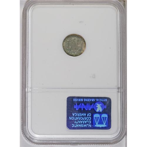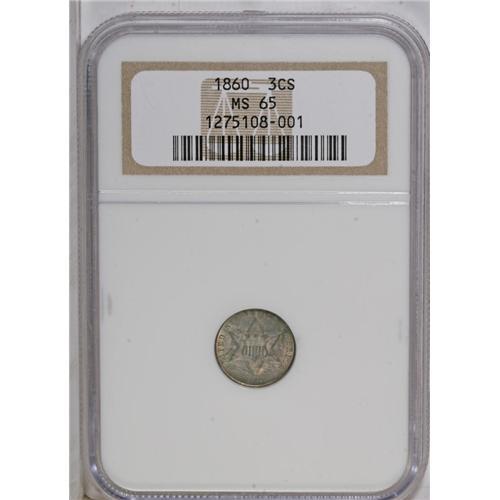 <B>1860 3CS MS65 NGC.</B></I> Lustrous with heavy rose and violet patina in the center, while gold and blue-green toning is nestled at the periphery. Sharply struck and remarkably well-preserved. Census: 17 in 65, 4 finer (8/06).<BR><I>From The Jones Beach Collection.</B></I><BR><BR><b>Shipping:</b> Coin/Currency (<a target="_blank" href="http://www.heritageauctions.com/common/shipping.php">view shipping information</a>)