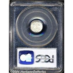 <B>1860<3CS> MS65 PCGS.</B></I> This is a lovely example of the Type Three trime. Both sides are blemish-free, essentially untoned, and well struck, save for weakness on the upper reverse peripheral stars. Population: 19 in 65, 7 finer (3/04). <BR><BR><B>Important notice:</B> Heritage usually auctions material at the rate of 200-250 lots per hour. On some occasions eBay Live bid software or the Internet may not be able to keep up with the pace of the auction. We recommend placing a realistic absentee bid now as insurance to avoid disappointment. Occasionally the auctioneer may eliminate or reject an eBay Live bid, and the auctioneer may also reopen a lot after the close of the eBay live bidding (usually because we missed an audience bid), and may reject your bid even if it shows you as the winning bidder. By bidding via eBay Live, you agree that Heritage may award the lot to another bidder at its sole discretion under the circumstances described above or any other reasonable circumstances. Since eBay bids are not shown to us until we open the lot on the floor, we treat those bids just like floor bids. In most cases the floor responds before the eBay bid is presented to us, due to Internet lag time, so for consistency we have made it a policy that floor bids are always considered first over tie eBay live bids. Also please note that all Heritage lots purchased through eBay Live carry a 20% Buyer's Premium. Please make sure you read the Terms and Conditions before you bid.