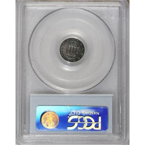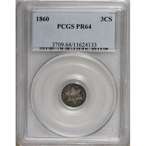 <B>1860 3CS PR64 PCGS.</B></I> Walter Breen (1977) writes of the 1860 proof trime: "Survivors represent only a small minority of the original mintage (1,000 pieces). Some 538 sold ... the rest melted." Lilac and cobalt-blue patina covers both sides of this near-Gem, and a well executed strike brings up most of the design features, except for softness in some of the reverse stars and the leaves. A linear strike-through is located along the left border of the reverse. Population: 30 in 64, 6 finer (4/07).<BR><BR><b>Shipping:</b> Coins & Currency (<a target="_blank" href="http://www.heritageauctions.com/common/shipping.php">view shipping information</a>)