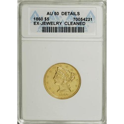 <B>1860 $5 --Cleaned, Ex-Jewelry--ANACS. AU50 Details.</B></I> NGC Census: (9/67). PCGS Population (8/16). Mintage: 19,700. Numismedia Wsl. Price for NGC/PCGS coin in AU50: $750. (#8284)<BR><BR><B>Coin Engraver:</B> Christian Gobrecht<BR><BR><b>Shipping:</b> Coins & Currency (<a target="_blank" href="http://www.heritageauctions.com/common/shipping.php">view shipping information</a>)