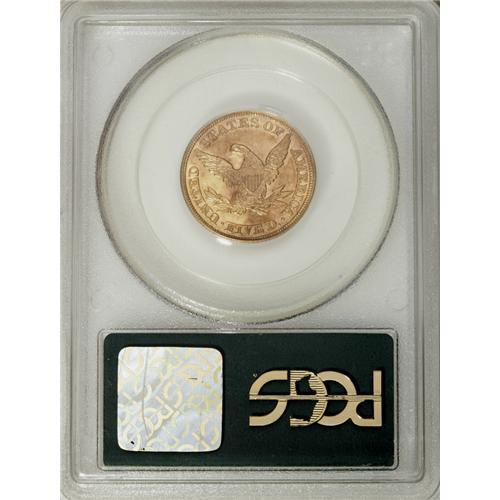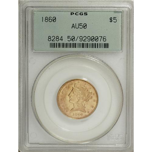 <B>1860 $5 AU50 PCGS.</B></I> This sharp and lustrous example approaches Mint State, but does have wispy field marks on each side. The reverse is die doubled, with the spread most evident on UNITED. Perhaps the entire business strike issue of 19,763 pieces has this characteristic, although it is unlisted in any standard reference. Housed in an old green label holder. Population: 9 in 50, 18 finer (12/06).<BR><BR><b>Shipping:</b> Coins & Currency (<a target="_blank" href="http://www.heritageauctions.com/common/shipping.php">view shipping information</a>)