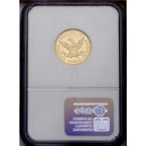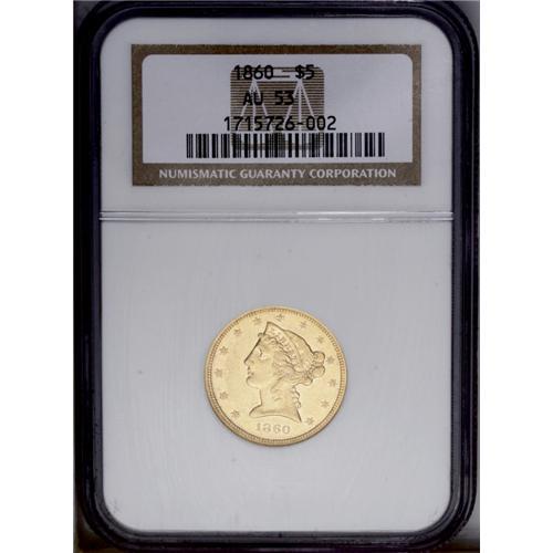 <B>1860<$5> AU53 NGC.</B></I> Appealing honey-gold surfaces with only a modicum of abrasions, none singularly mentionable. The strike is a bit above average, with light circulation wear visible on the eagle's wingtips.<BR><I>From The Steve Glenn Collection.</B></I> <BR><BR><B>Important notice:</B> Heritage usually auctions material at the rate of 200-250 lots per hour. On some occasions eBay Live bid software or the Internet may not be able to keep up with the pace of the auction. We recommend placing a realistic absentee bid now as insurance to avoid disappointment. Occasionally the auctioneer may eliminate or reject an eBay Live bid, and the auctioneer may also reopen a lot after the close of the eBay live bidding (usually because we missed an audience bid), and may reject your bid even if it shows you as the winning bidder. By bidding via eBay Live, you agree that Heritage may award the lot to another bidder at its sole discretion under the circumstances described above or any other reasonable circumstances. Since eBay bids are not shown to us until we open the lot on the floor, we treat those bids just like floor bids. In most cases the floor responds before the eBay bid is presented to us, due to Internet lag time, so for consistency we have made it a policy that floor bids are always considered first over tie eBay live bids. Also please note that all Heritage lots purchased through eBay Live carry a 20% Buyer's Premium. Please make sure you read the Terms and Conditions before you bid. This lot is being auctioned in conjunction with a live floor auction by Heritage Galleries & Auctioneers. All final auction and invoice information will be supplied by Heritage Galleries & Auctioneers, and all other information should be considered preliminary. Lot:2747 <BR><BR><B>Winning Notification and Billing:</B> After the FINAL session in this auction is complete, Heritage will send e-mail and snail mail invoices. This process normally takes several days. All final auction and invoice information will be supplied by Heritage Galleries & Auctioneers, and all other information should be considered preliminary. <BR><BR>This auction will be conducted on a live auction floor and over the Internet through eBay Live. If you choose to place an absentee bid, please take a moment to <font color='#0000ff'><u><a href='http://pages.ebay.com/liveauctions/help/before/laabsentee.html'>learn how eBay Live absentee bidding works</a></u></font><font color='#000000'>