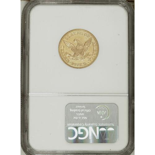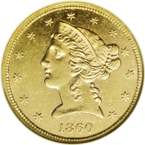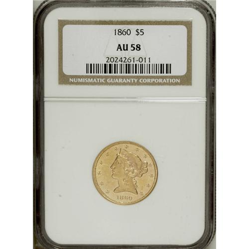 <B>1860 $5 AU58 NGC.</B></I> A low mintage issue but unheralded as such because it lacks a mintmark, the 1860 half eagle is nonetheless rare in any grade. The present example offers much prooflikeness and considerable cameo contrast, along with light yellow-gold and lilac patina. Light, even ticks appear under a loupe, but the strike is sharp and the eye appeal is extremely high. Census: 23 in 58, 6 finer (12/06).<BR><BR><b>Shipping:</b> Coin/Currency (<a target="_blank" href="http://www.heritageauctions.com/common/shipping.php">view shipping information</a>)