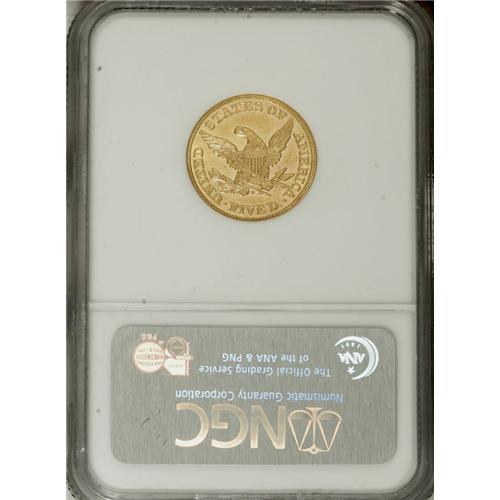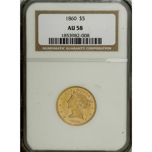 <B>1860 $5 AU58 NGC.</B></I> Ample luster resides on bright peach-gold surfaces, and all of the design elements are well brought up. The fields yield some prooflike characteristics, and highlight the motifs, especially when the coin is rotated beneath a light source. A few light contact marks do not detract from the overall eye appeal of this charming half eagle. Census: 24 in 58, 6 finer (1/07).<BR><BR><b>Shipping:</b> Coins & Currency (<a target="_blank" href="http://www.heritageauctions.com/common/shipping.php">view shipping information</a>)
