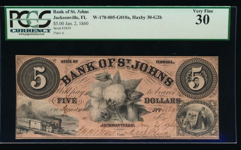 One 1860 $5 Bank of St Johns Obsolete Note PCGS 30.