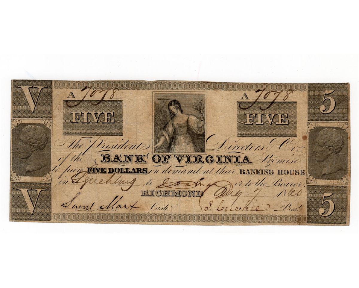 One 1860 $5 Bank of Virginia Richmond Obsolete Bank Note.