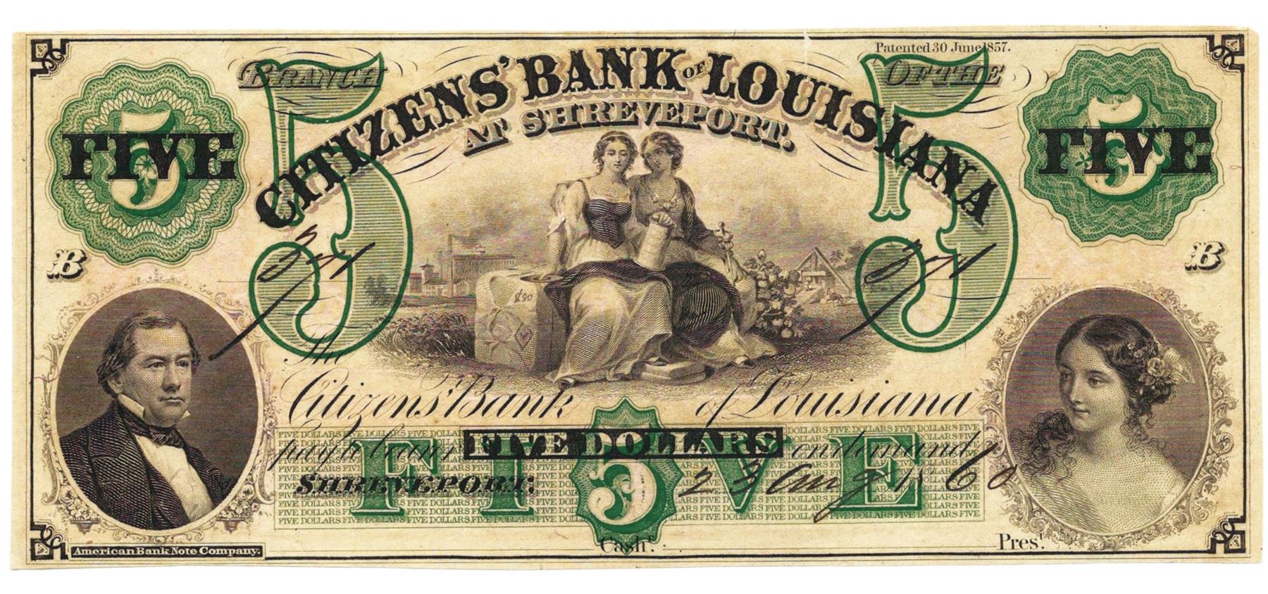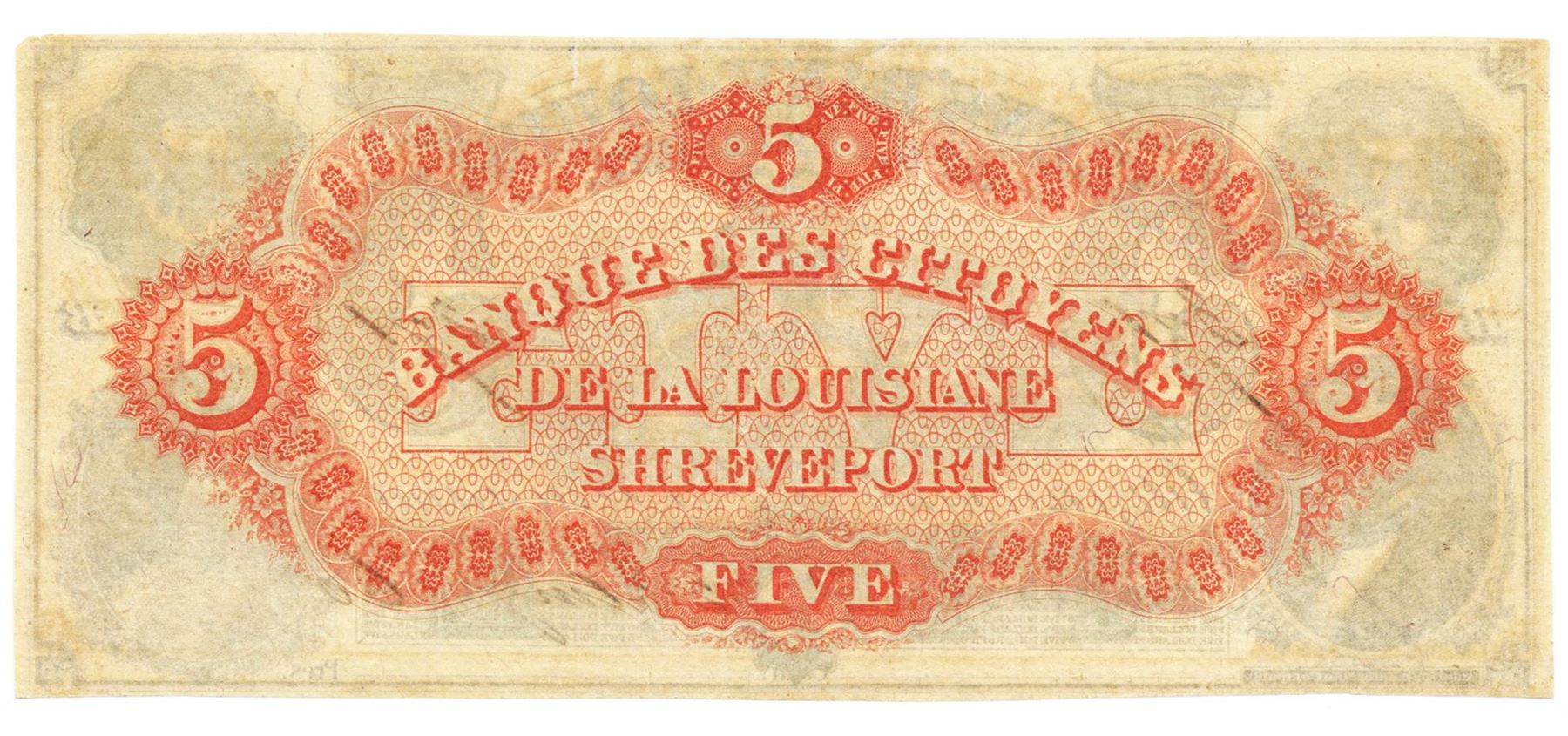 One 1860 $5 Citizens' Bank of Lousiana at Shreveport Bank Note