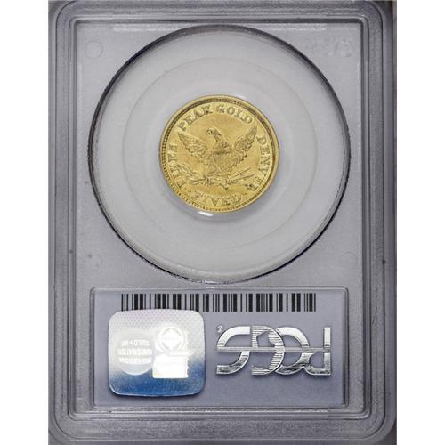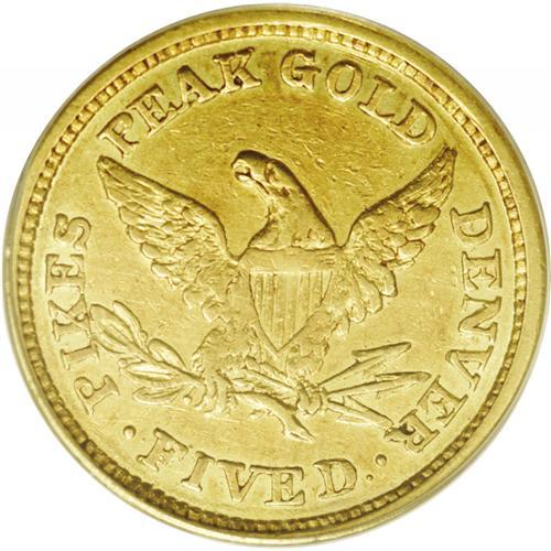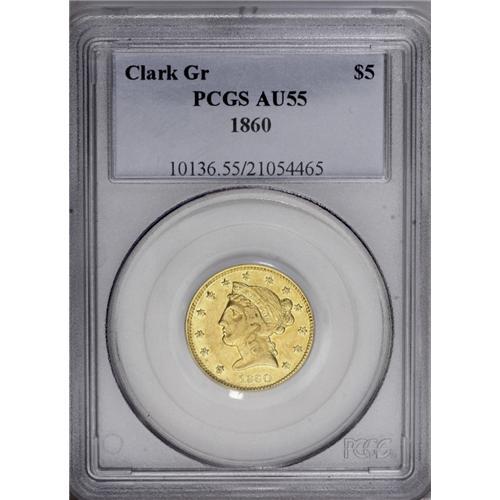 <B>1860<$5> Clark, Gruber & Co. Five Dollar AU55 PCGS.</B></I> K.2, R.4. After the 1858 discovery of gold in Colorado, Clark, Gruber & Company filled the early need for a local mint, creating the forerunner of what would later become the Denver Mint and establishing a solid reputation for high-quality coinage. This high grade example shows especially attractive surfaces that are reddish-gold in the center of each side with pale olive around the margins. Softly struck in the centers, as always, the only mentionable surface flaws are a couple of small planchet voids in the lower right obverse field.