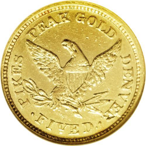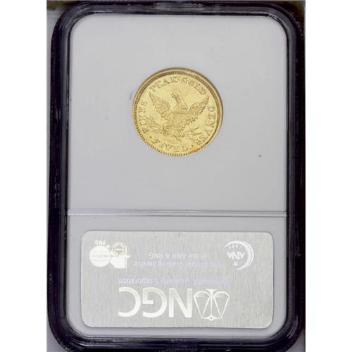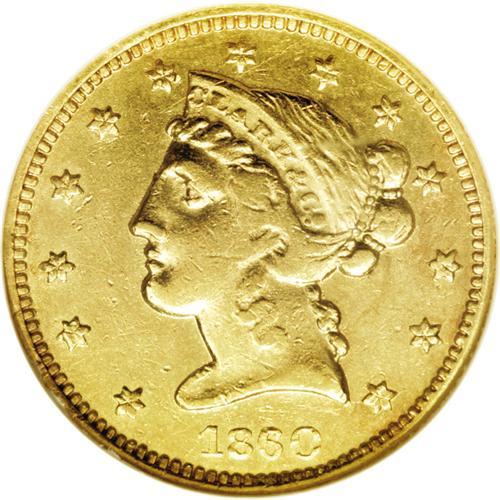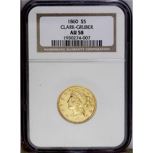 <B>1860<$5> Clark, Gruber & Co. Five Dollar AU58 NGC.</B></I> Kagin-2, R.4. Unlike most others, this example is brilliant and lustrous with lovely orange-gold color, a departure from the more plentiful green-gold examples. The central obverse and reverse are weakly struck as usual, with all other details boldly defined. A few insignificant hairlines and abrasions are noted. Listed on page 362 of the 2006 <I>Guide Book.</B></I> <BR><BR><B>Important notice:</B> Heritage usually auctions material at the rate of 200-250 lots per hour. On some occasions eBay Live bid software or the Internet may not be able to keep up with the pace of the auction. We recommend placing a realistic absentee bid now as insurance to avoid disappointment. Occasionally the auctioneer may eliminate or reject an eBay Live bid, and the auctioneer may also reopen a lot after the close of the eBay live bidding (usually because we missed an audience bid), and may reject your bid even if it shows you as the winning bidder. By bidding via eBay Live, you agree that Heritage may award the lot to another bidder at its sole discretion under the circumstances described above or any other reasonable circumstances. Since eBay bids are not shown to us until we open the lot on the floor, we treat those bids just like floor bids. In most cases the floor responds before the eBay bid is presented to us, due to Internet lag time, so for consistency we have made it a policy that floor bids are always considered first over tie eBay live bids. Also please note that all Heritage lots purchased through eBay Live carry a 20% Buyer's Premium. Please make sure you read the Terms and Conditions before you bid. This lot is being auctioned in conjunction with a live floor auction by Heritage Galleries & Auctioneers. All final auction and invoice information will be supplied by Heritage Galleries & Auctioneers, and all other information should be considered preliminary. Lot:4764 <BR><BR><B>Winning Notification and Billing:</B> After the FINAL session in this auction is complete, Heritage will send e-mail and snail mail invoices. This process normally takes several days. All final auction and invoice information will be supplied by Heritage Galleries & Auctioneers, and all other information should be considered preliminary. <BR><BR>This auction will be conducted on a live auction floor and over the Internet through eBay Live. If you choose to place an absentee bid, please take a moment to <font color='#0000ff'><u><a href='http://pages.ebay.com/liveauctions/help/before/laabsentee.html'>learn how eBay Live absentee bidding works</a></u></font><font color='#000000'>