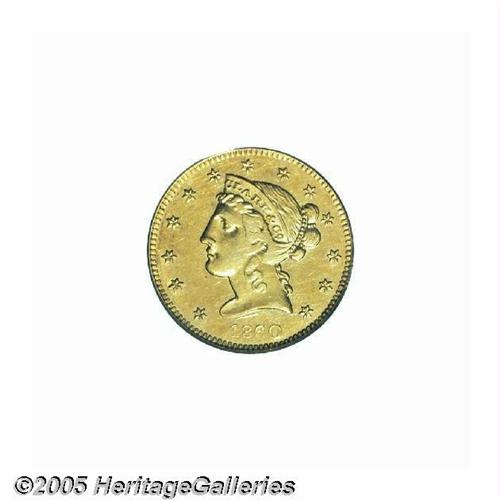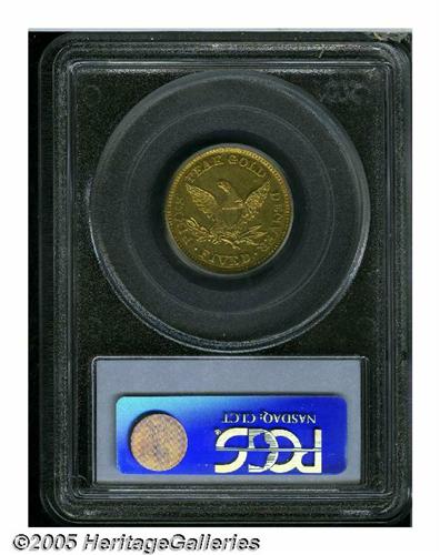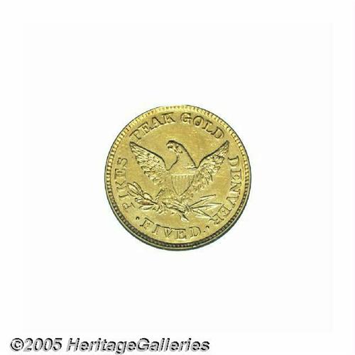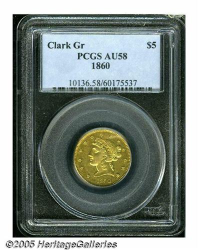 <B>1860<$5> Clark, Gruber & Co. Five Dollar AU58 PCGS.</B></I> K-2, R.4. Rich apricot-gold in color, the surfaces have only faint slide marks, aside from a concealed pinscratch below the denomination near the rim. Typically struck in the centers, not a surprise given the high relief of the portrait. The Kagin reference only mentions a die crack from 12:30 to the C in CLARK, but the present piece has at least a dozen other slender die cracks, as made. Listed on page 309 of the 2005 <I>Guide Book.</B></I><BR><I>From The Great Western Collection of Territorial Gold.</B></I>
