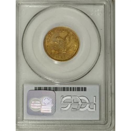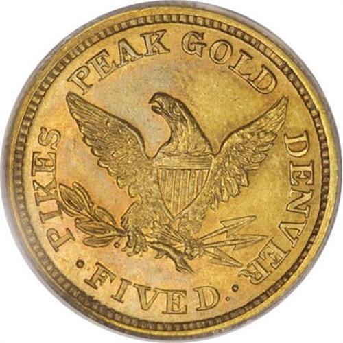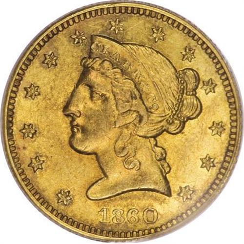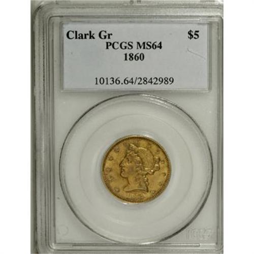 <B>1860 $5 Clark, Gruber & Co. Five Dollar MS64 PCGS.</B></I> While the centers of this issue are usually found weakly struck, that is certainly not the case with this piece. On this coin, the design motifs are sharply defined throughout. This is especially notable on the hair of Liberty on the obverse, and the eagle's plumage and the shield lines on the reverse. It is highly unusual to locate any Clark, Gruber coin with mint luster, as these pieces were extensively circulated in Colorado in lieu of the uncertain value of the locally mined gold dust. However, on this piece the mint luster is inescapable and one of the dominant features. Another feature of note is the rich, original reddish-tinged gold color seen over each side. One of the finest preserved example of this important Territorial issue. Listed on page 366 of the 2008 <I>Guide Book</B></I>. Population: 2 in 64, 2 finer (7/07).<BR><BR><b>Shipping:</b> Coins & Currency (<a target="_blank" href="http://www.heritageauctions.com/common/shipping.php">view shipping information</a>)