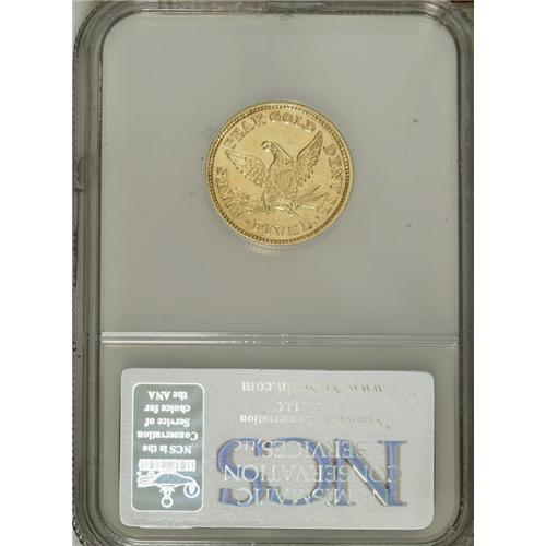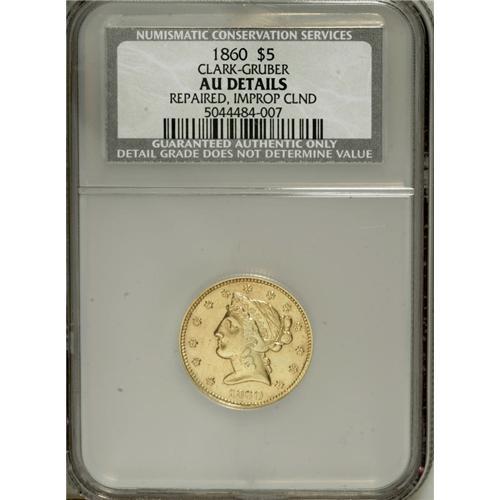 <B>1860 $5 Clark, Gruber & Co. Five Dollar--Repaired, Improperly Cleaned--NCS. AU Details.</B></I> K-2, R.4. Repaired on the reverse field above the eagle's neck, and polished to simulate a prooflike appearance. Still a richly detailed example of this popular and very scarce pioneer gold issue. Listed on page 362 of the 2007 <I>Guide Book.</B></I><BR><BR><b>Shipping:</b> Coins & Currency (<a target="_blank" href="http://www.heritageauctions.com/common/shipping.php">view shipping information</a>)