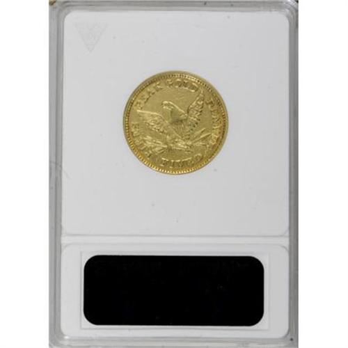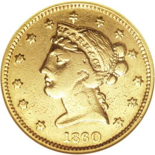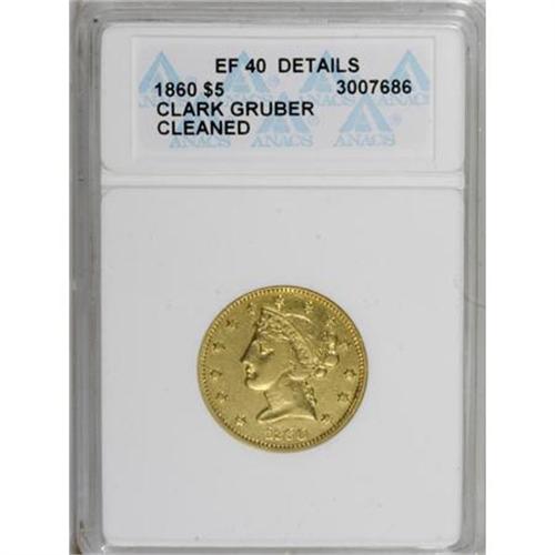 <B>1860 $5 Clark, Gruber & Co. Five Dollar--Cleaned--ANACS. XF40 Details.</B></I> K-2, R.4. Unlike the 1860 ten and twenty dollar Clark, Gruber & Co. denominations, the five dollar pieces closely imitate the designs of their Federal counterparts. The fields are a bit glossy from a cleaning, and the lower obverse has several pinpoint marks, but luster emerges from protected areas. Listed on page 366 of the 2008 <I>Guide Book.</B></I><BR><BR><b>Shipping:</b> Coins & Currency (<a target="_blank" href="http://www.heritageauctions.com/common/shipping.php">view shipping information</a>)