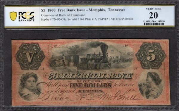 One 1860 $5 Memphis TN Obsolete Note PCGS 20.