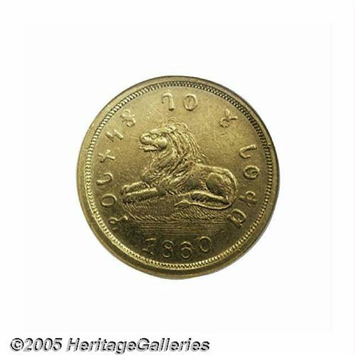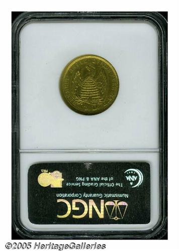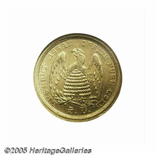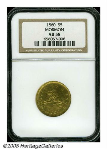 <B>1860<$5> Mormon Five Dollar AU58 NGC.</B></I> The Mormon's final coins were struck using Colorado gold, which was found to be around .917 gold with the balance being natural alloys (primarily silver). The obverse depicts the Lion of Judah, which symbolizes God's power and mercy while the reverse displays a beehive protected by an eagle with outstretched wings. The Deseret alphabet is used to state HOLINESS TO THE LORD on the obverse, with the date 1860 below, and the reverse states DESERET ASSAY OFFICE PURE GOLD and 5 D. below. In the eagle's sinister (left) claw a clutch of arrows are found, and in the dexter (right) claw is a branch (likely an olive branch) with five leaves and three berries. All devices are well struck for this issue, and we note traces of luster in the protected areas. The surfaces show scattered handling nicks from brief circulation, and the coin is a pleasing medium yellow-gold color on the obverse and reverse. Traces of a die line or crack are found below the 1 in the date extending up to the base of that digit. Perhaps 100-150 are known, and this coin is probably just about in the top ten percent of those for its superlative condition. An important Territorial issue that boasts rarity, condition and beautifully rendered devices. Listed on page 309 of the 2005 <I>Guide Book.</B></I> Population: 3 in 58, 11 finer (6/05).<BR><I>From The Great Western Collection of Territorial Gold.</B></I>