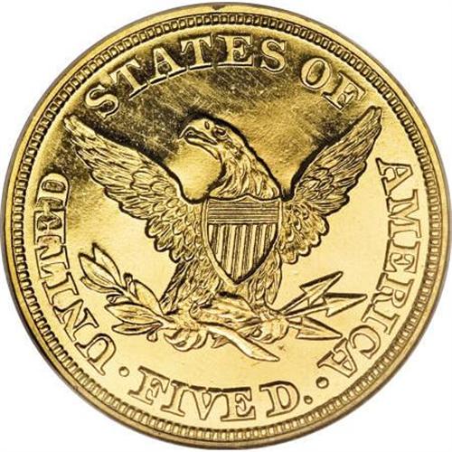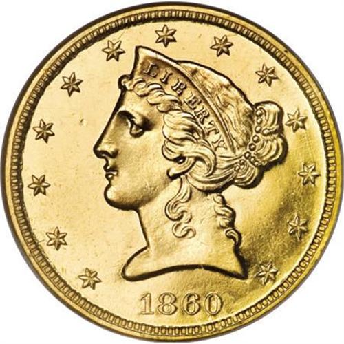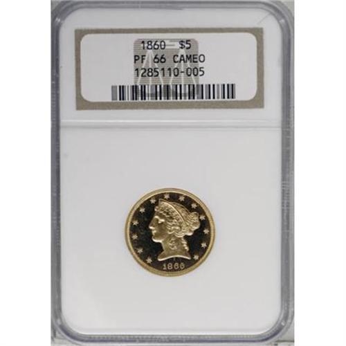 <B>1860 $5 PR66 Cameo NGC.</B></I> Despite a stated mintage of 62 proofs, the 1860 five dollar gold is far more elusive in proof format than that figure would suggest. As Akers noted in his work on the denomination, the majority of pieces likely never left the Mint. A similar pattern appears for the 1859 and 1861 proof half eagles as well; the mintages appear high, yet those two issues are similarly elusive. In 1862, production of proof fives fell to 35 pieces, which was likely much closer to the number of specimens actually sold.<BR> It is perhaps unsurprising that the Mint would make a miscalculation of this kind, as proofs were not offered to the general public until 1858. The Mint, not knowing what demand would be, likely overproduced the issue and subsequently melted the unsold remainders. The attrition of almost a century and a half claimed a number of others, and Garrett and Guth, in their 2006 work on American gold coinage, stated that "probably about 10 examples" remain today, several of which are impounded in museum collections. The number of specimens available to private collectors is very small, and the issue is an extreme rarity in the numismatic marketplace. As stated by Garrett and Guth, "It can sometimes be years between the offerings of an 1860 half eagle in Proof."<BR> The elegant Premium Gem offered here displays excellent contrast, a hallmark for the 1860 proof half eagles, and strong visual appeal. The strike is bold, and while the surfaces show a few tiny flaws (such as a small depression in the left obverse field), the overall visual appeal is remarkable, particularly when one considers the early issue. This specimen is the lone finest Cameo example certified by NGC (1/08), and it is immensely desirable as such.<BR><I>From The Southwest Collection.</B></I><BR><BR><b>Shipping:</b> Coins & Currency (<a target="_blank" href="http://www.heritageauctions.com/common/shipping.php">view shipping information</a>)