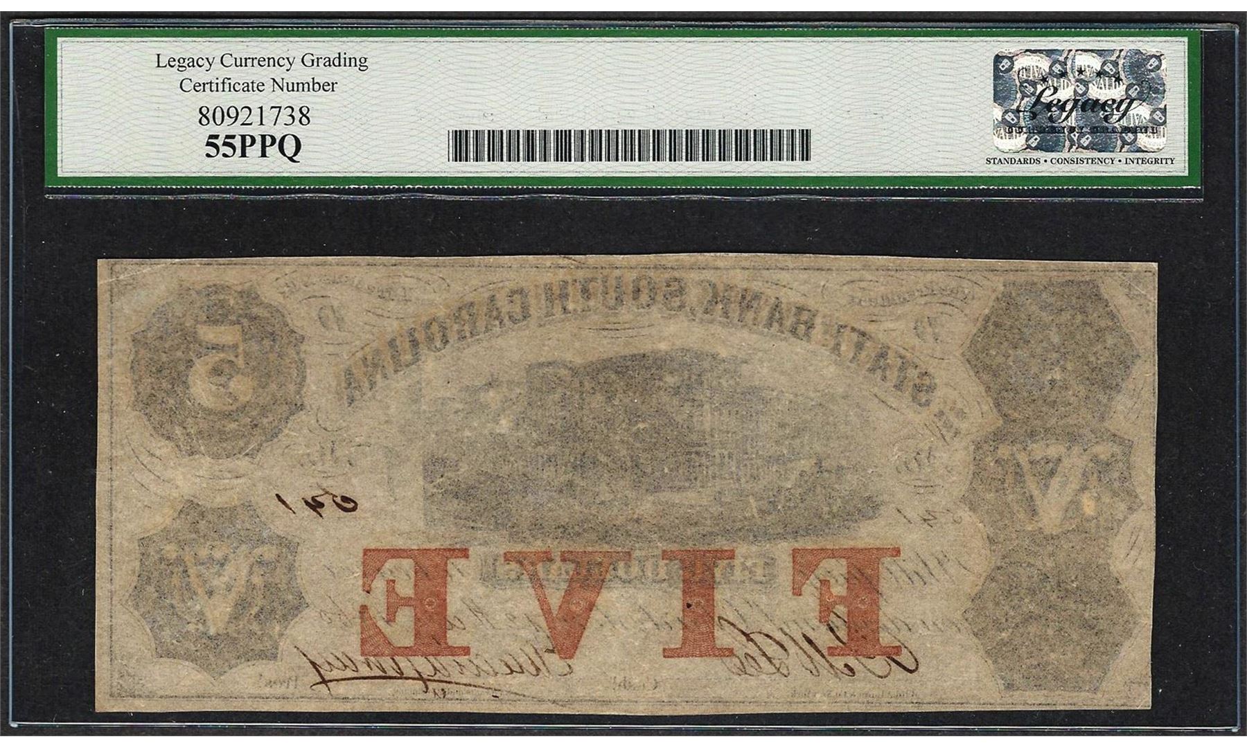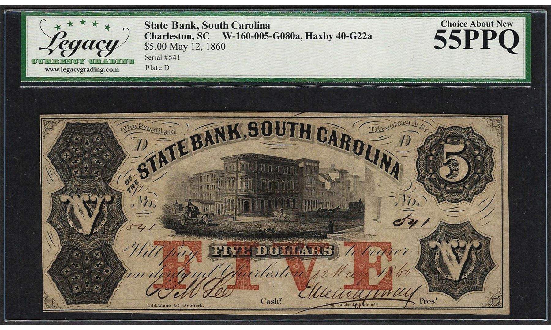One 1860 $5 State Bank South Carolina Obsolete Note Legacy Choice About New 55PPQ. Legacy Graded.
