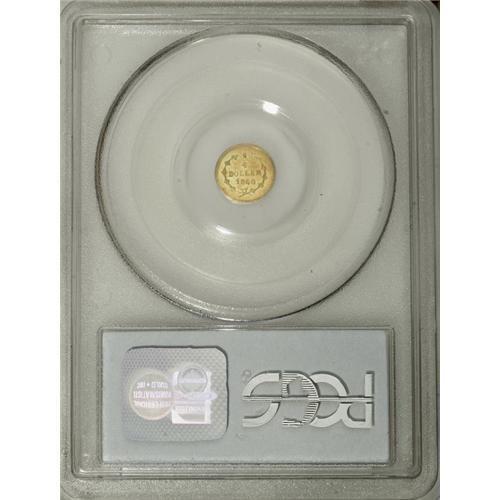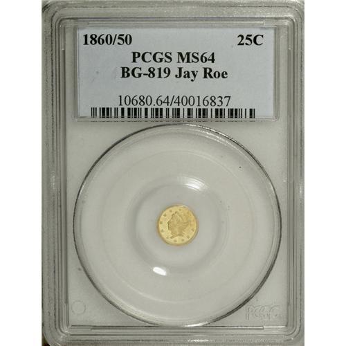 <B>1860/50 25C Liberty Round 25 Cents, BG-819, R.4, MS64 PCGS.</B></I> Ex: Jay Roe. A radiant yellow-gold near-Gem with prooflike fields and clean surfaces. Well struck with bold legends. Population: 5 in 64, 1 finer (3/07).<BR><I>Ex: Jay Roe Collection (Bowers and Merena, 9/03), lot 300.</B></I><BR><BR><b>Shipping:</b> Coins & Currency (<a target="_blank" href="http://www.heritageauctions.com/common/shipping.php">view shipping information</a>)