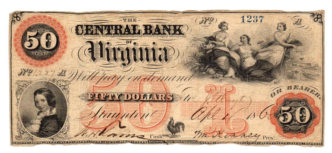 One 1860 $50 The Central Bank of Virginia Obsolete Note.