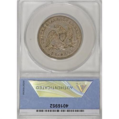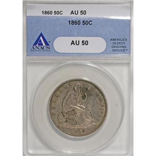 <B>1860 50C AU50 ANACS.</B></I> NGC Census: (5/44). PCGS Population (11/66). Mintage: 302,700. Numismedia Wsl. Price for NGC/PCGS coin in AU50: $210. (#6299)<BR><BR><B>Coin Engraver:</B> Christian Gobrecht<BR><BR><b>Shipping:</b> Coins & Currency (<a target="_blank" href="http://www.heritageauctions.com/common/shipping.php">view shipping information</a>)