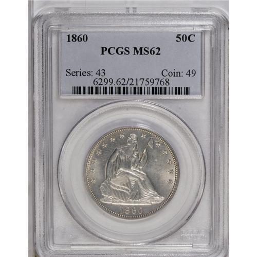 <B>1860<50C> MS62 PCGS.</B></I> The boldly defined design elements rise from subtly lustrous silver-gray fields. The scattered marks that partly define the grade are more prominent on the reverse.