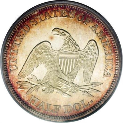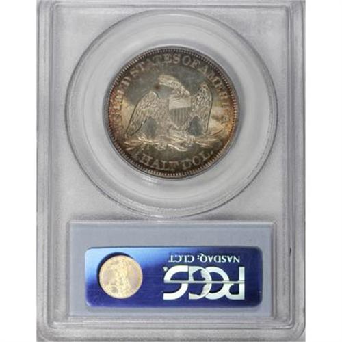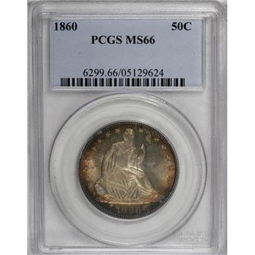 <B>1860 50C MS66 PCGS.</B></I> Type Two Reverse. This may be the sharpest strike we have seen on a business strike Seated Liberty half dollar. Every design detail on each side is fully defined. Each individual star radial is present, and Liberty's head and hair details are remarkably detailed. The surfaces are highly lustrous with frosty ivory color and radiant mint bloom. A few small abrasions are evident only with close examination, and are generally hidden within the devices. Both sides have rich orange, blue, and lilac toning close to the borders. The present opportunity should not be missed. Only eight finer examples of the No Motto, No Arrows design type have been certified by PCGS. Population: 3 in 66, 1 finer (11/07).<BR><I>Ex: Long Beach Signature (Heritage, 9/06), lot 1930, which realized $17,250.<BR>From The Madison Collection.</B></I><BR><BR><B>Coin Engraver:</B> Christian Gobrecht<BR><BR><b>Shipping:</b> Coins & Currency (<a target="_blank" href="http://www.heritageauctions.com/common/shipping.php">view shipping information</a>)