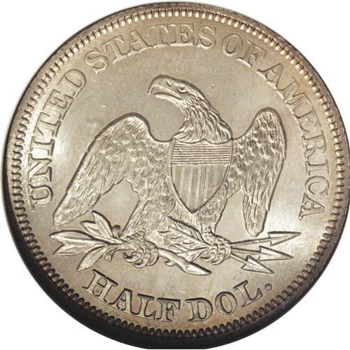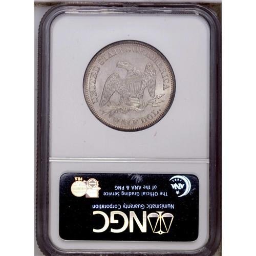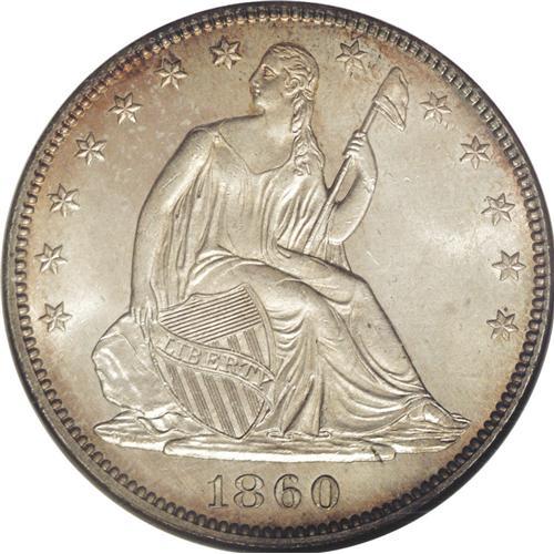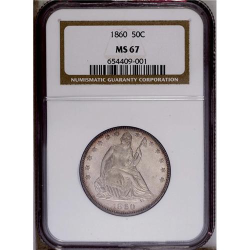 <B>1860<50C> MS67 NGC.</B></I> Tail Hub Variety One. WB-101. The Philadelphia Mint produced 303,700 half dollars in 1860. Wiley and Bugert, in their <I>The Complete Guide to Liberty Seated Half Dollars,</B></I> note that the 1860 is "very scarce in any grade" and "currently underrated." On Hub Variety One, the base of the L in HALF is shorter and distinctly separated from the letter F; on Hub Variety Two, the base of the L almost touches the base of F. Specialists should note that Wiley and Bugert assign Mint State examples of WB-101 a Low R.6 rating. (Mint State examples of Tail Hub Variety Two/WB-102 are rated R.5.)<BR> This gorgeous Superb Gem yields exquisitely struck design elements and radiant luster, along with whispers of delicate light russet and electric-blue patina that gravitate to the borders. A few trivial contact marks scattered over each side are mentioned solely for accuracy. Light die polish lines are evident in the fields. The original, uncleaned surfaces of this particular specimen preclude it from having come from the Guatemala hoard, in which virtually all examples were abrasively cleaned. This sole coin has been graded MS67 by NGC, and another by PCGS, with none finer by either service (4/06).
