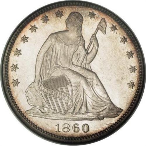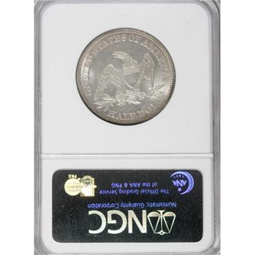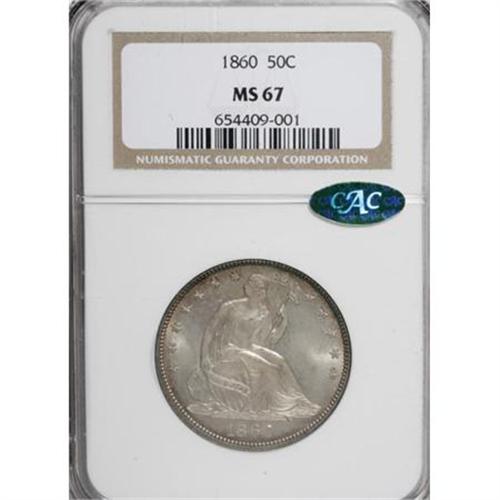 <B>1860 50C MS67 NGC. CAC.</B></I> Tail Hub Variety One. WB-101. The Philadelphia Mint produced 303,700 half dollars in 1860. Wiley and Bugert, in <I>The Complete Guide to Liberty Seated Half Dollars,</B></I> note that the 1860 is "very scarce in any grade" and "currently underrated." On Hub Variety One, the base of the L in HALF is shorter and distinctly separated from the letter F; on Hub Variety Two, the base of the L almost touches the base of F. Specialists should note that Wiley and Bugert assign Mint State examples of WB-101 a Low R.6 rating. (Mint State examples of Tail Hub Variety Two/WB-102 are rated R.5.)<BR> This gorgeous Superb Gem yields exquisitely struck design elements and radiant luster, along with whispers of delicate light russet and electric-blue patina that gravitate to the borders. A few trivial contact marks scattered over each side are mentioned solely for accuracy. Light die polish lines are evident in the fields. The original, uncleaned surfaces point to a source other than the Guatemala hoard, in which virtually all examples were abrasively cleaned. Census: 1 in 67, 0 finer (1/08).<BR><I>From The Southwest Collection.</B></I><BR><BR><B>Coin Engraver:</B> Christian Gobrecht<BR><BR><b>Shipping:</b> Coins & Currency (<a target="_blank" href="http://www.heritageauctions.com/common/shipping.php">view shipping information</a>)