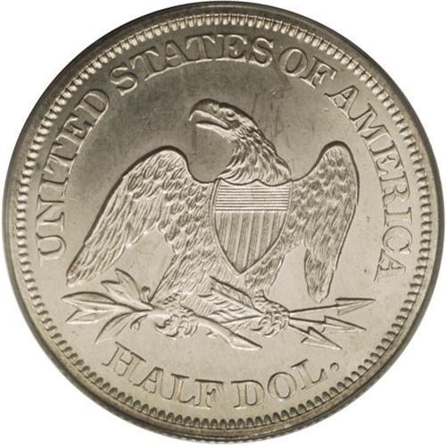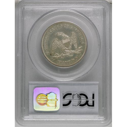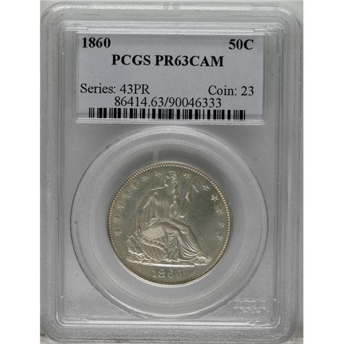 <B>1860 50C PR63 Cameo PCGS.</B></I> Type Two Reverse. Delicate chestnut toning visits this penetratingly struck and suitably mirrored specimen. The few faint hairlines are expected of the grade. Although the <I>Guide Book</B></I> reports a mintage of 1,000 proofs, about half of this production was eventually melted as unsold. Population: 2 in 63 Cameo, 7 finer (2/07).<BR><BR><b>Shipping:</b> Coins & Currency (<a target="_blank" href="http://www.heritageauctions.com/common/shipping.php">view shipping information</a>)