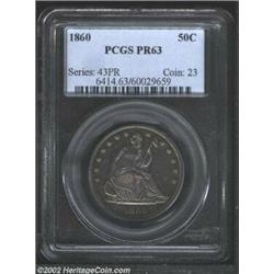 1860 50C PR63 PCGS. Intense electric-blue and golden-brown colors appear when the coin is rotated under a light. A razor-sharp and carefully preserved example. HALF DOL is lightly strike doubled. Far scarcer than the mintage of 1,000 pieces would indicate, as much of the production was melted as unsold. Important notice: We expect to be auctioning lots at the rate of 200-250 per hour. Sometimes eBay Premier live bid software cannot keep up with that pace, so we strongly recommend that you place a realistic proxy bid now as insurance to avoid disappointment. Also please note that all Heritage/CAA lots purchased through eBay Premier carry a 20% Buyer's Premium. Please make sure you read the Terms and Conditions.