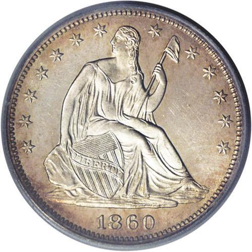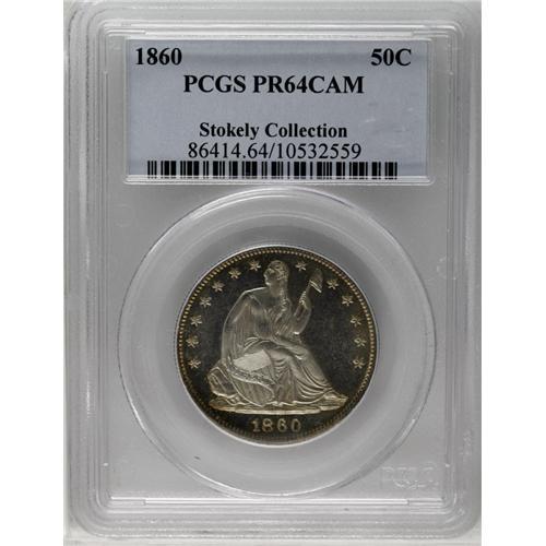 <B>1860<50C> PR64 Cameo PCGS.</B></I> Type Two Reverse. Honey-brown toning embraces the borders of this decisively struck near-Gem. A few vertical hairlines are detected on the right obverse field. Although 1,000 proofs were struck, the majority of the issue went unsold and was melted. Proofs from 1860 are scarcer than many later dates in the series with lesser productions. Population: 4 in 64 Cameo, 3 finer (6/06).<BR><I>From The Stephen Stokely #1 PCGS Registry Set of Proof Seated Half Dollars.</B></I>