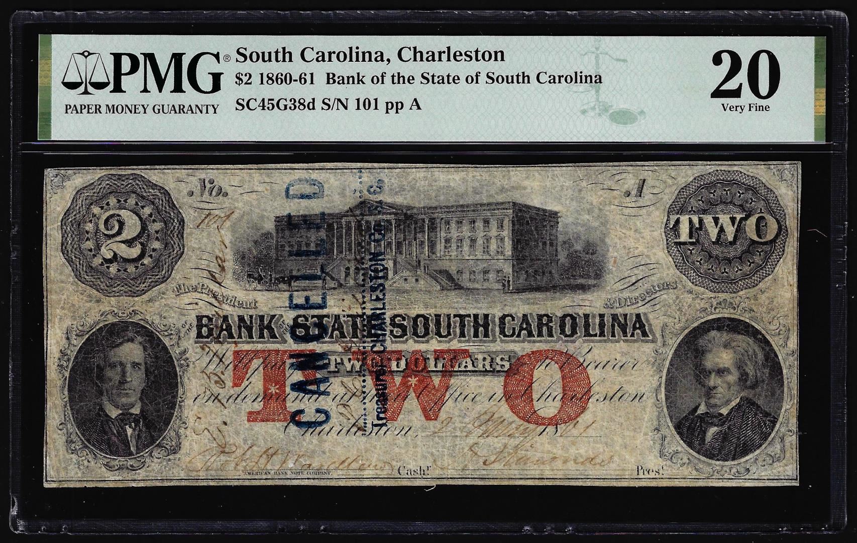 One 1860-61 $5 Bank of the State of South Carolina Obsolete Note SC45G38d PMG Very Fine 20. PMG Certified.