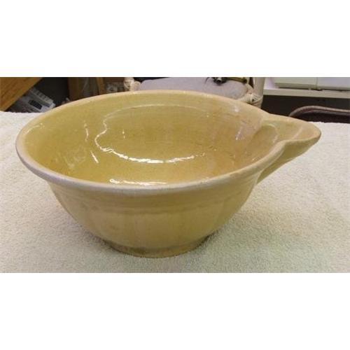 This 10" yellow ware batter/lipped bowl with embossed pattern was made between 1860 and 1890 by the Croxall and C.C. Thompson potteries. These batter bowls can be very difficult to find in any condition. Wear and signs of age are to be expected, since this was utility ware and received heavy use in busy households. This one is no exception as it has a chip on the spout and three hairlines. My 2003 Yellow Ware Book has values of $295.00-$495.00 depending on size. I think even considering the happy use this one incurred and being it is one of the larger bowls that my price of $125.00 is a fair price.