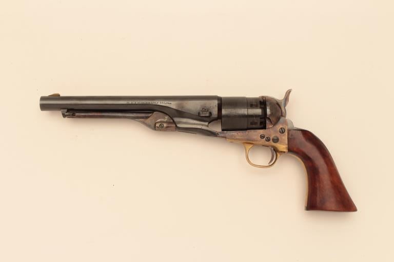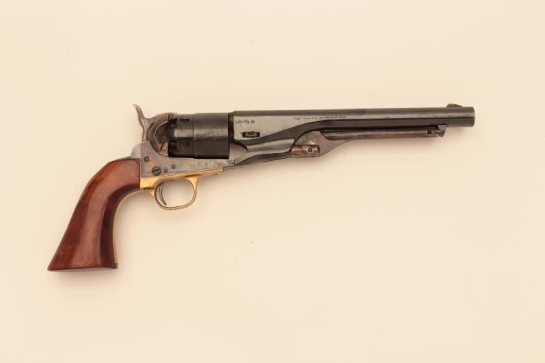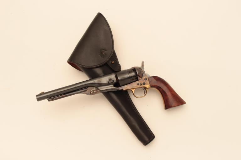 1860 Army style .44 caliber percussion revolver with 4 screw frame (Cut for stock), S/N 44609. Blue and case colors. Made by Pietta Italy. Near fine with holster. Older production showing limited to no use but poor storage. (Percussion)Est.: $200-$400